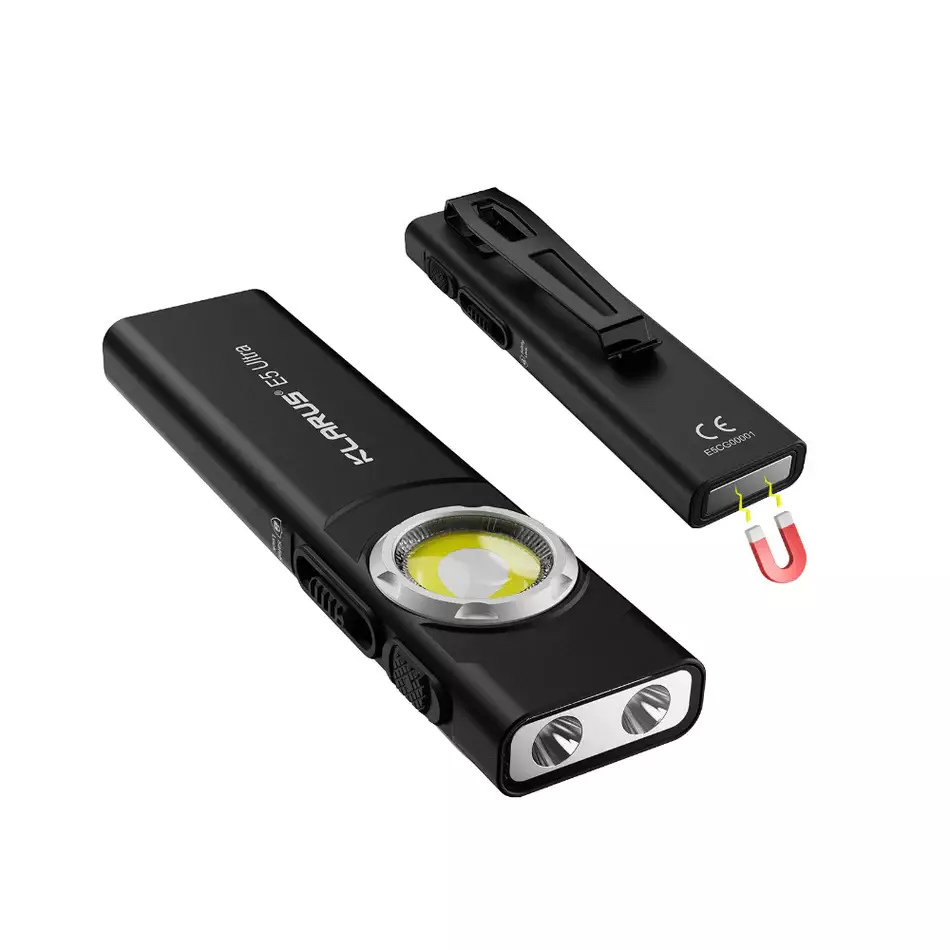 KLARUS E5 Ultra er en ultraslank, lommevennlig EDC-lommelykt med tre lyskilder: hvit spot (hoved-LED), hvit COB-flomlys og rødt lys.