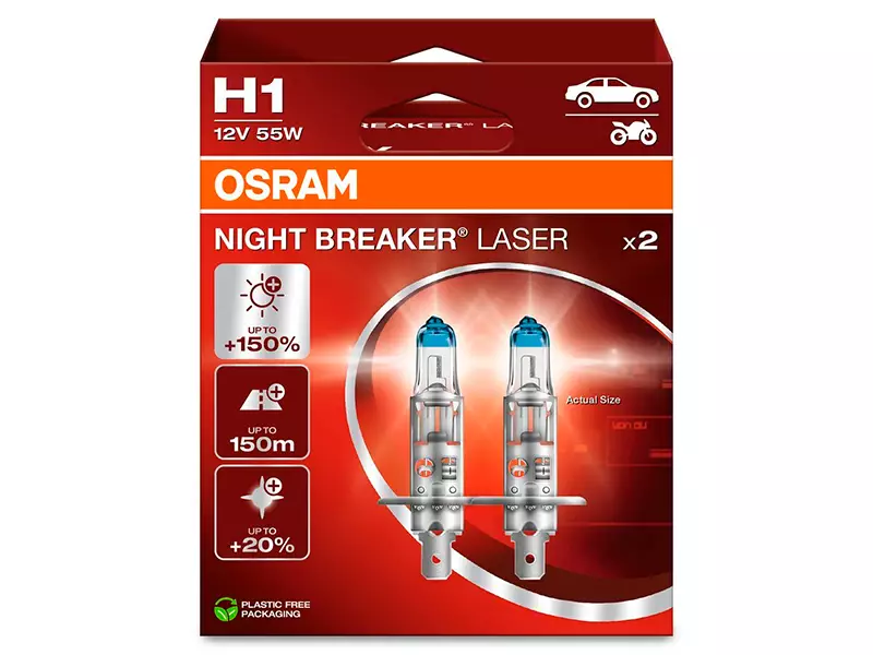 Night Breaker Laser er en ekstremt kraftig halogenpære til bil. Det nye toppproduktet i den pålitelige Night Breaker-familien gir mer lys, synlighet og sikkerhet. Med opptil 150% lysere og 20% hvitere lys enn vanlige halogenpærer skapes utmerkede forhold for sikker og utrettelig kjøring. Rekkevidde opptil 150 m. Takket være deres forbedrede egenskaper, gir Night Breaker Laser-pærer bedre sikt og kortere reaksjonstid.