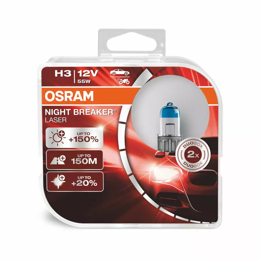 Night Breaker Laser er en ekstremt kraftig halogenpære. Det nye flaggskipsproduktet fra den pålitelige Night Breaker-familien gir mer lys, sikt og sikkerhet. Opptil 150% mer lys og 20% hvitere lys enn vanlige halogenpærer. Dette gjør Night Breaker Laser til et utmerket valg for sikker kjøring. Lyspæren har en rekkevidde på opptil 150 m takket være dens forbedrede funksjoner sammenlignet med vanlige halogenpærer.