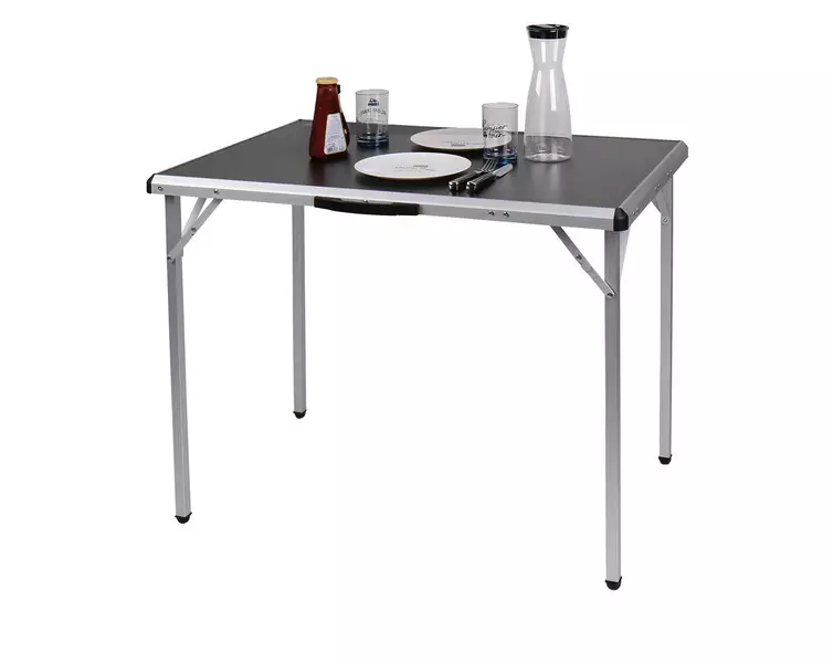 Tore – Lett campingbord med aluminiumslist Kompakt og stabilt bord for 2–4 personer. Sort MDF-bordplate med aluminiumsramme Belastning: opptil 50 kg Bena kan skrus ut 2 cm for å jevne ut underlag... Les mer