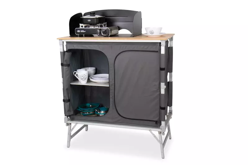 Det sammenleggbare campingkjøkkenet er klart til bruk på sekunder takket være det enkle oppsettssystemet. Kjøkkenet har en bambus benkeplate, en lett aluminiumsramme, solide MDF-hyller og en vindskjerm.