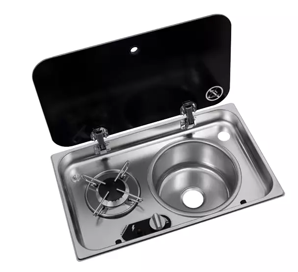Denne kompakte koke-/vaskekombinasjonen fra Carbest er ideell for campingbiler og varebiler. Utstyrt med en gassbrenner med piezotenning og tennsikring samt et glasslokk med automatisk gassavstengning.