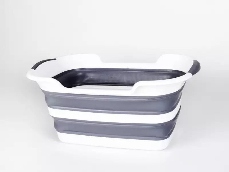En allsidig balje eller kurv med innebygd avløp. To praktiske bærehåndtak gjør den enkel å håndtere og oppbevare.