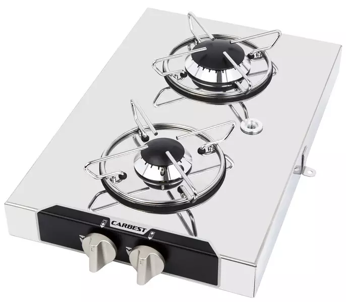 Carbest komfyr med rustfri ståloverflate og to gassbrennere med tennsikring. Passer utmerket i bobil og campingvogn.