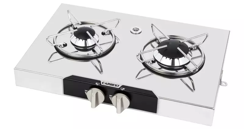 Lag mat på farten med denne Carbest gasskomfyren i rustfritt stål. En trygg og effektiv løsning for campingkjøkken, komplett med manuell tenning og to brennere.